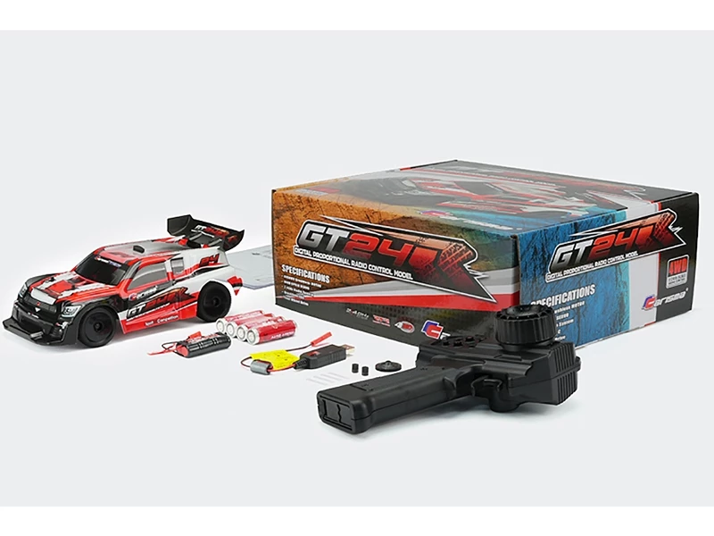 Completely ready-to-run with everything included in the box, the GT24R provides scale looking performance at an affordable price. Traction is in abundance with the slipper clutch adjustable, shaft driven 4wd transmission with bevel geared front and rear differentials. Damper sprung independent suspension soaks up any rough stuff, while the powerful brushless motor and 1S LiPo battery combination brings the GT24R to life.