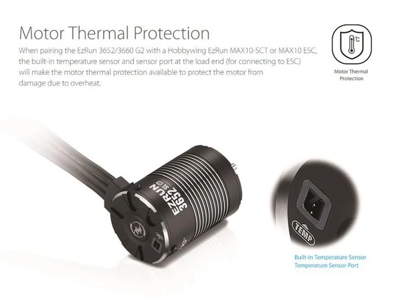 When pairing the EzRun 3652/3660 G2 with a Hobbywing EzRun MAX10-SCT or MAX10 ESC, the built-in temperature sensor and sensor port at the load end (for connecting to ESC) will make the motor thermal protection available to protect the motor from damage due to overheat.